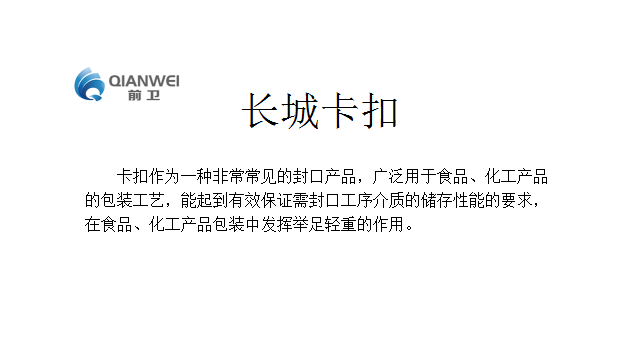 博野县前卫卡扣线材有限公司始创于1996年,是集设计、研发、生产、销售、服务为一体的生产厂家。 公司现有生产流水线17条,主要生产铝卡扣、铝丝、长城卡扣、双孔袋、打卡机及灌装设备。产品行销全国各地。