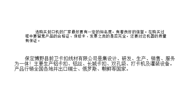 博野前卫卡扣生产的打卡机可分为50型卧式打卡机、50型立式打卡机、气动打卡机及脚踏打卡机。